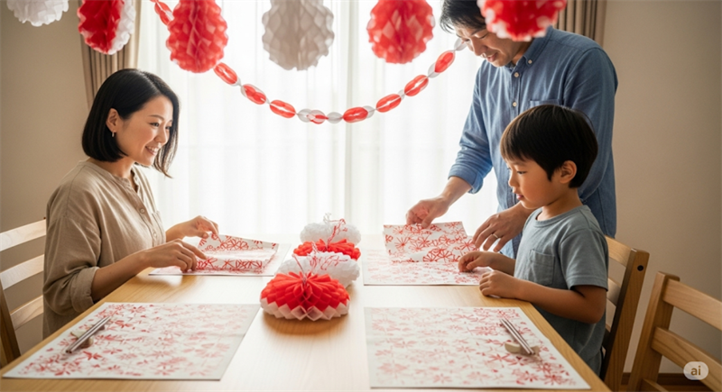 - キッチンペーパーやクッキングシート:意外に思われるかもしれませんが、清潔なキッチンペーパーやクッキングシートも使えます。赤いペンで周りを縁取ったり、下に赤い紙を敷いたりするだけで、お祝いの雰囲気が出ます。